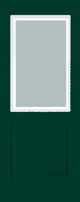 Infuse natural elegance with this Hunter green 1-panel fiberglass door. The Perimeter half lite design provides balanced light and privacy. Weather-resistant construction ensures minimal maintenance over its lifetime.